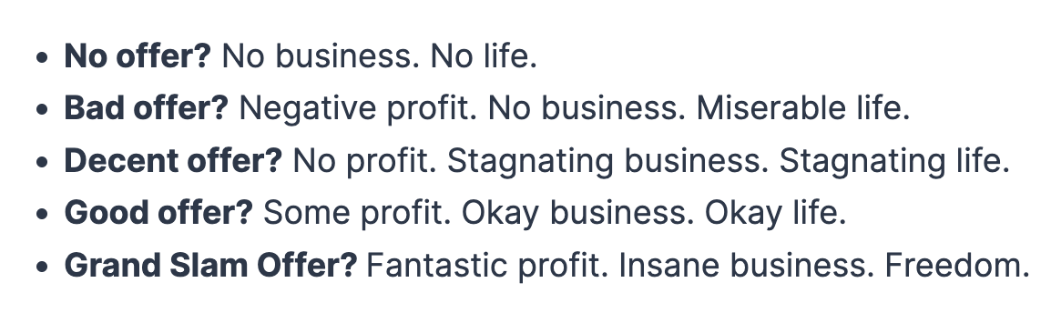 The cornerstone of your business model is a great offer, or what Alex Hormozi calls a "grand slam offer."